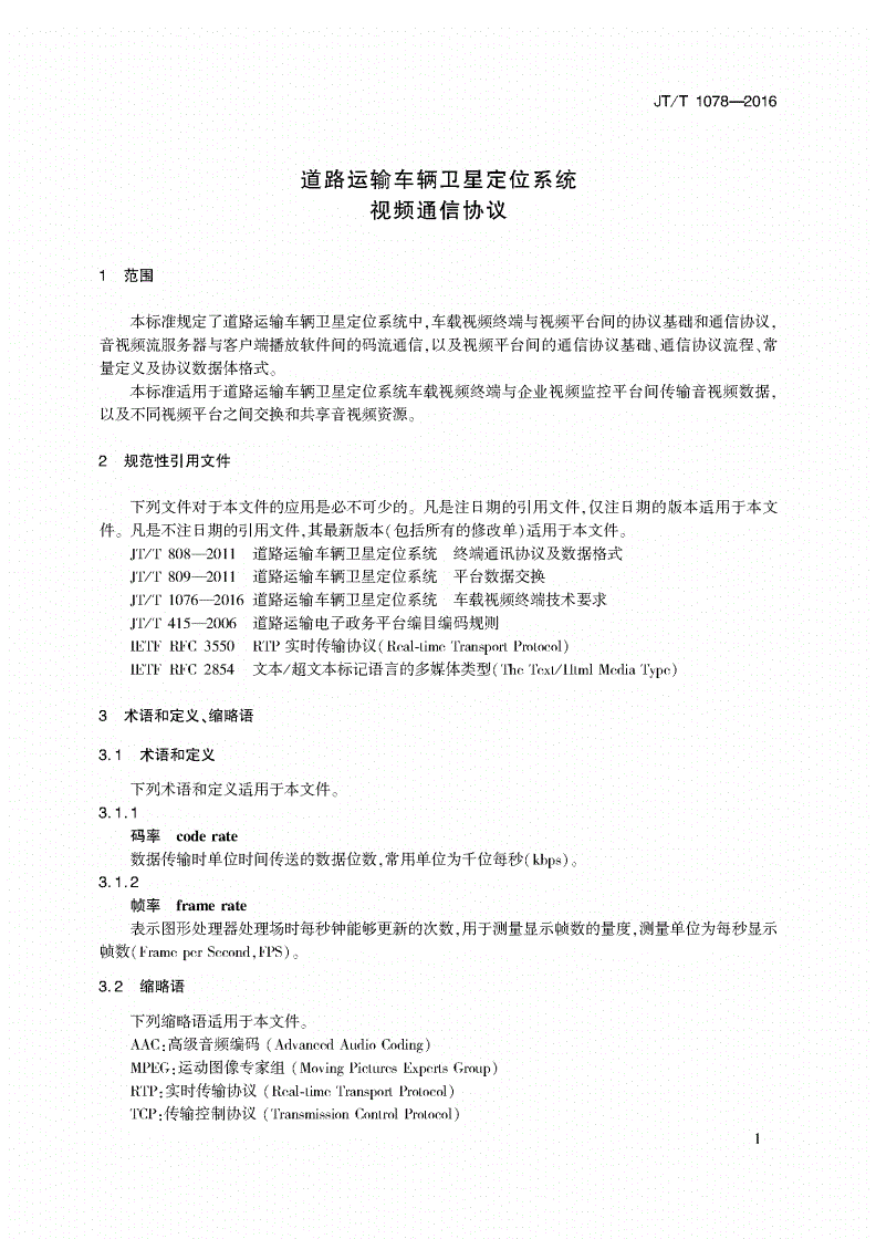 中華人民共和國交通運輸行業標準JT/T1078-2016道路運輸車輛衛星定位系統視頻通信協議
